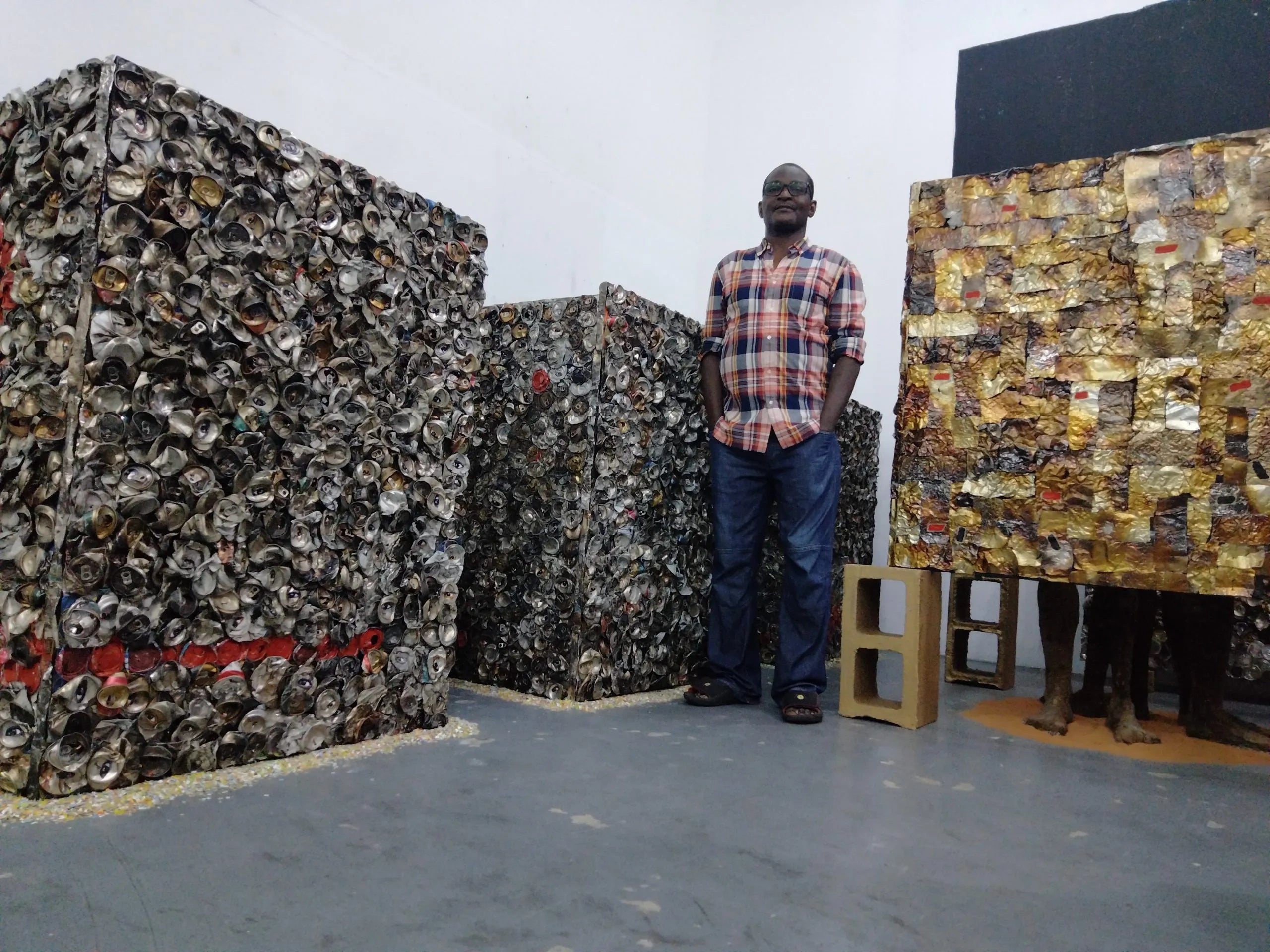 Over the years, Osahenye’s artistic style has evolved from large-scale neo-expressionistic paintings to a process of experimental appropriation. He has become known for his use of found objects such as burnt and crushed beverage cans, water bottles, fabric, juice packs, newspapers, and chicken wire. These objects are recontextualized and transformed into intricate, multi-media works that tackle pressing societal issues. His hallmark of layering, stacking, and sequencing materials—sometimes in the thousands—creates monumental pieces that convey both beauty and a powerful narrative.